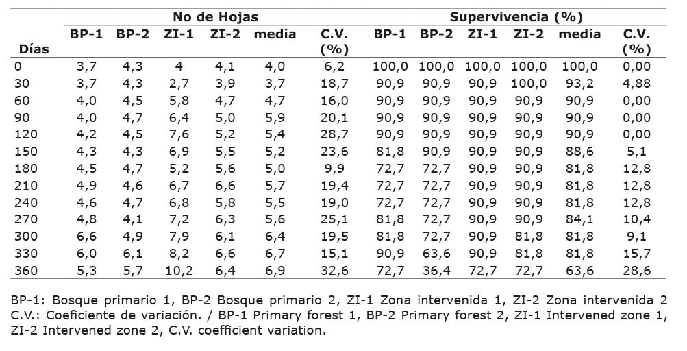 En la medida del número de hojas que se realizó en campo, se registró un mayor promedio en el día 360 con una media de 6 hojas (Cuadro 6). En la supervivencia hasta el día 330, todas las hileras presentaron porcentajes superiores al 60 %, a los 360 días la hilera bosque primario 2 (BP-2) disminuyó a 36 %. En el área foliar promedio se obtuvo 24,3 cm2 para las hileras de bosque primario y 45,2 cm2 en las hileras de zona intervenida.