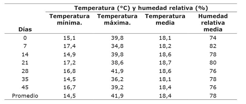 Las variables meteorológicas registradas dentro del invernadero fueron las siguientes: temperatura mínima de 14,5 °C, temperatura máxima 41,9 °C, una temperatura promedio de 18,4 °C y promedio de humedad relativa media del 78 % (Cuadro 7).
