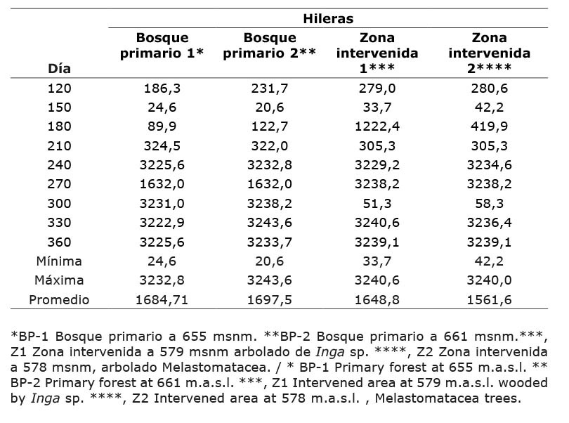 En cuanto a las medidas de luminosidad registrada en luxes y convertida a µg mol m-2 s-1 (Cuadro 8), se presentó un mayor promedio en las hileras BP-1 y BP-2 de bosque primario y zona intervenida 1 (ZI-1), con valores que sobrepasaron los 1600 µg mol m-2 s-1, mientras que en la zona intervenida 2 (ZI-2), se registró menor luminosidad. El análisis de varianza entre la luminosidad promedio de las hilaras en bosque primario y la zona intervenida, no reportó diferencias significativas para p≤ 0,05, con un promedio en 1605 µg mol m-2 s-1 en la zona intervenida y 1691 µg mol m-2 s-1 en el bosque primario.