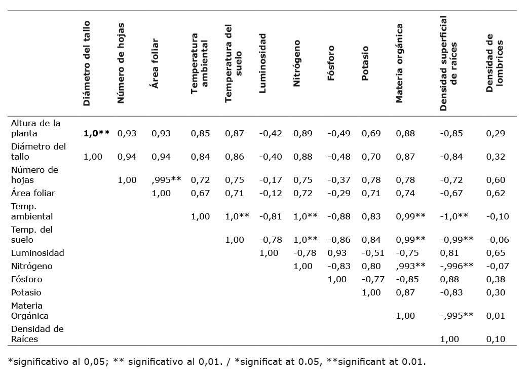El análisis de correlación, mostró que el crecimiento en altura, diámetro y número de hojas presentó una relación directa con la temperatura del aire y del suelo, y con el contenido de nitrógeno, lo cual corroboró que estos factores influyeron para un mayor desarrollo de las plantas.