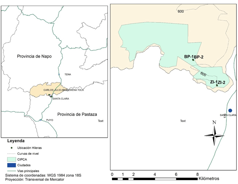 El presente trabajo se ejecutó en el período 2018-2020 en el Centro de Investigación, Posgrado y Conservación Amazónica (CIPCA), de la Universidad Estatal Amazónica en el cantón Arosemena Tola, provincia de Napo, Ecuador, el cual consta de 2848 ha, de las cuales 2000 ha son de bosque primario, 300 ha de pastos y en el resto se presentan áreas intervenidas con presencia de cultivos y donde se desarrollaron diferentes tipos de arbolados.