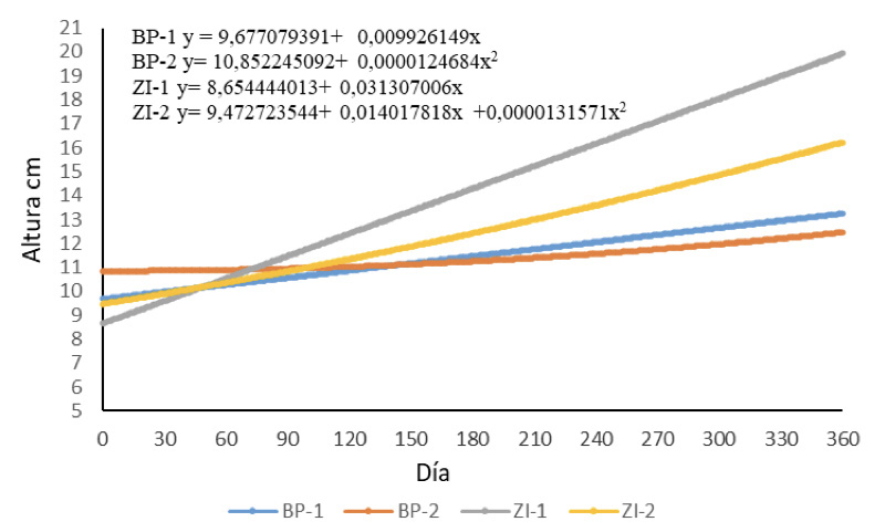 Las curvas de crecimiento (Figura 4) mostraron que el mayor crecimiento se alcanzó en la hilera zona intervenida 1 (ZI-1), con una media de 20 cm al finalizar el período. La hilera bosque primario 1 (BP-1) presentó un crecimiento constante con una velocidad de 0,01 cm día-1 y alcanzó a los 360 días una media de 13,3 cm. La hilera bosque primario 2 (BP-2) aceleró su crecimiento a partir del día 350, con una velocidad de crecimiento en esta etapa de 0,012 cm día-1 y alcanzó los 12,5 cm al final de la evaluación. La hilera zona intervenida 1 (ZI-1), presentó una velocidad constante de crecimiento de 0,031 cm día-1. La hilera zona intervenida 2 (ZI-2), presentó una velocidad de crecimiento de 0,02 cm día-1 hasta los 340 días, a partir de ahí aceleró a 0,03 cm día-1 y alcanzó una altura de 16,2 cm al final de la evaluación.