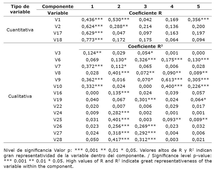 Cuadro 2. Contribución de las variables a los cinco primeros componentes del análisis factorial para datos mixtos, para la definición de tipologías de unidades de producción agroindustrial (UPA) de panela [azúcar moreno no centrifugado, sin refinar, obtenido de la evaporación y concentración del jugo de la caña de azúcar (Saccharum spp.)]. Departamento del Huila, Colombia. 2019.