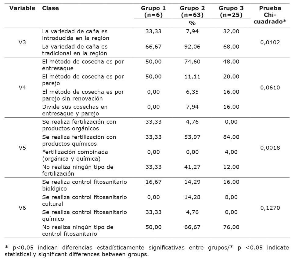 Table 3. Comparison between the three groups identified by the cluster analysis of agro-industrial production units (UPA) of panela [unrefined non centrifugal brown sugar, obtained from the evaporation and concentration of sugarcane (Saccharum spp.) juice], with respect to variables of section C (technical aspects of the crop). Huila, Colombia, 2019.