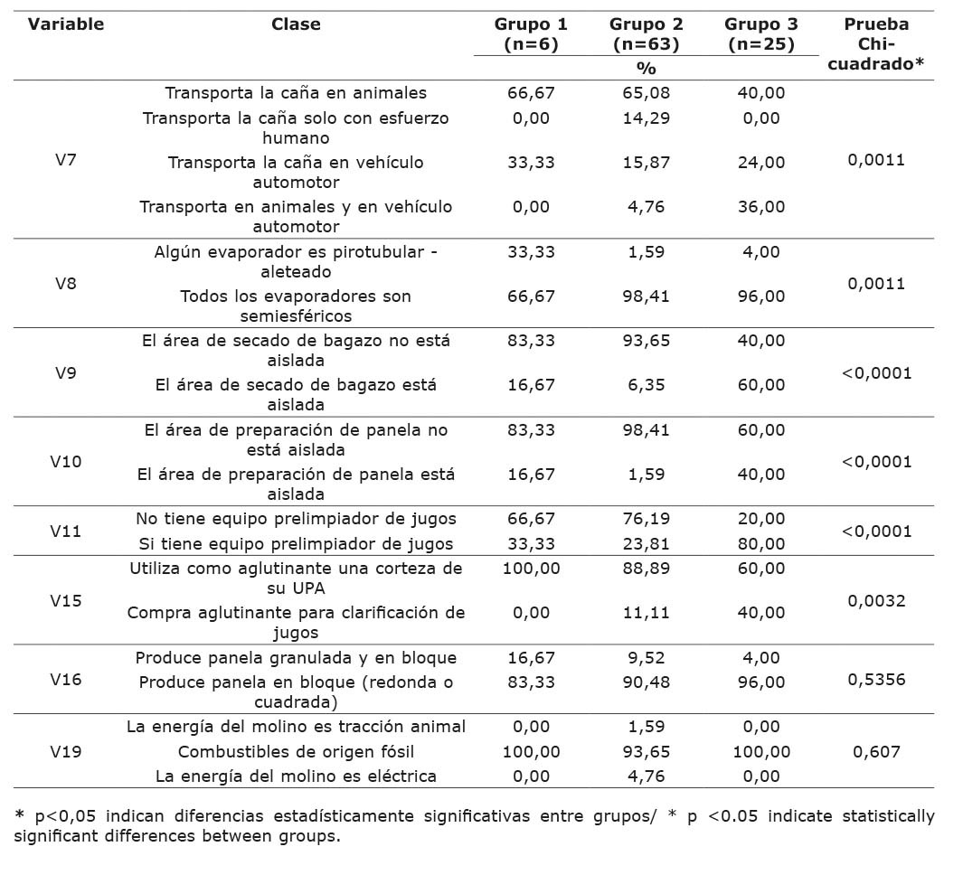 Table 4. Comparison between the three groups identified by the analysis of clusters of agro-industrial production units (UPA) of panela [unrefined non centrifugal brown sugar, obtained from the evaporation and concentration of sugarcane (Saccharum spp.) juice], with respect to variables of section D (Description processing plant). Huila, Colombia, 2019.