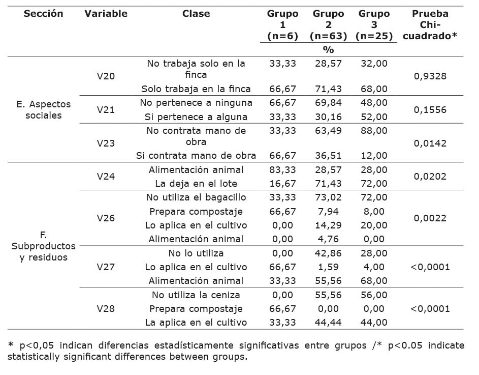 Table 5. Comparison between the three groups identified by the analysis of clusters of agro-industial production units (UPA) of panela [unrefined non centrifugal brown sugar, obtained from the evaporation and concentration of sugarcane (Saccharum spp.) juice], with respect to variables of section E (social aspects) and F (by-products and waste). Huila, Colombia, 2019.