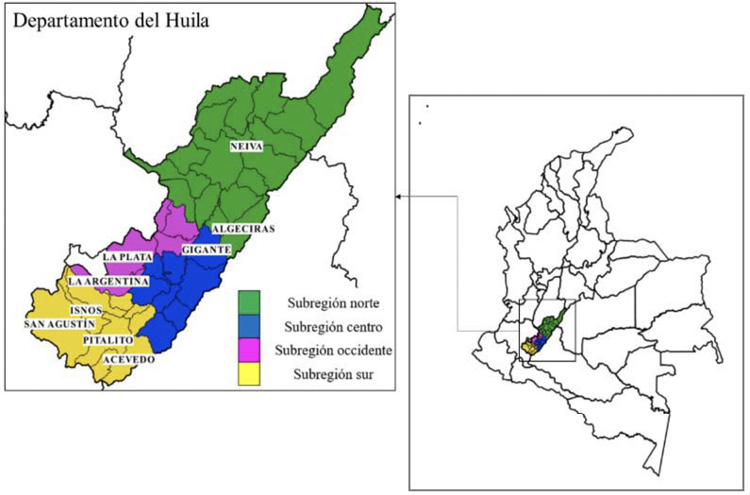 El departamento del Huila se encuentra localizado en la parte sur occidental de Colombia, con gran variedad de paisajes, tipos de relieve, diversidad de litologías, suelos y unidades morfoestructurales, producto de la fuerte actividad tectónica, evidenciada en la cantidad de fallas, la intensa actividad volcánica y la actividad sísmica (Instituto Geográfico Agustín Codazzi, 1994). El departamento se divide en cuatro subregiones: centro, norte, occidente y sur, dentro de las cuales se estudiaron nueve municipios en los que la producción de panela es importante para sus economías (Figura 1).
