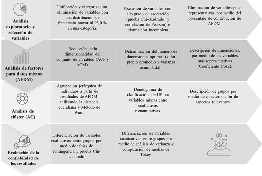 Figura 3. Metodología de construcción de tipología de unidades de producción agroindustrial (UPA) de panela [azúcar moreno no centrifugado, sin refinar, obtenido de la evaporación y concentración del jugo de la caña de azúcar (Saccharum spp.)], en el departamento del Huila, Colombia. 2019.