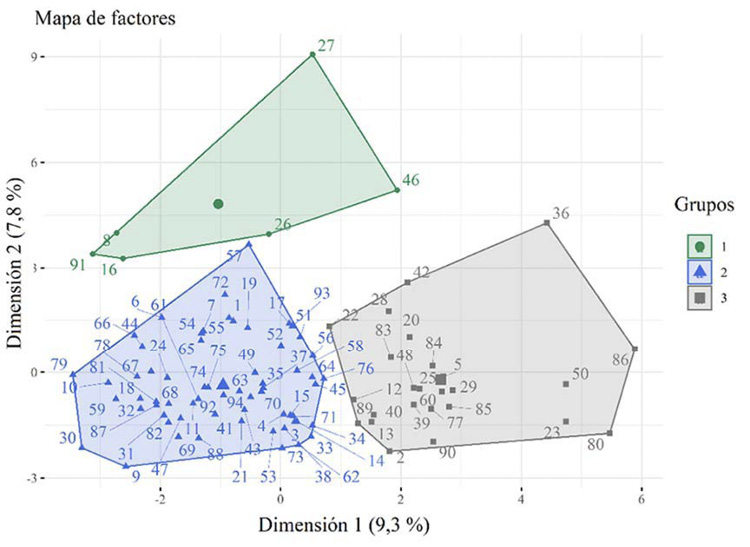 Con veintiocho variables seleccionadas en la etapa anterior (Cuadro 1), se realizó un análisis de factores para datos mixtos (AFDM), el cual incluyó una combinación del análisis de componentes principales para las variables cualitativas (ACP) y el análisis de correspondencia múltiple (ACM) para las variables categóricas (Kostov et al., 2015; Shukla et al., 2019), lo que asegura equilibrar la influencia de variables, tanto continuas como categóricas, y estudiar las relaciones entre todas las variables.