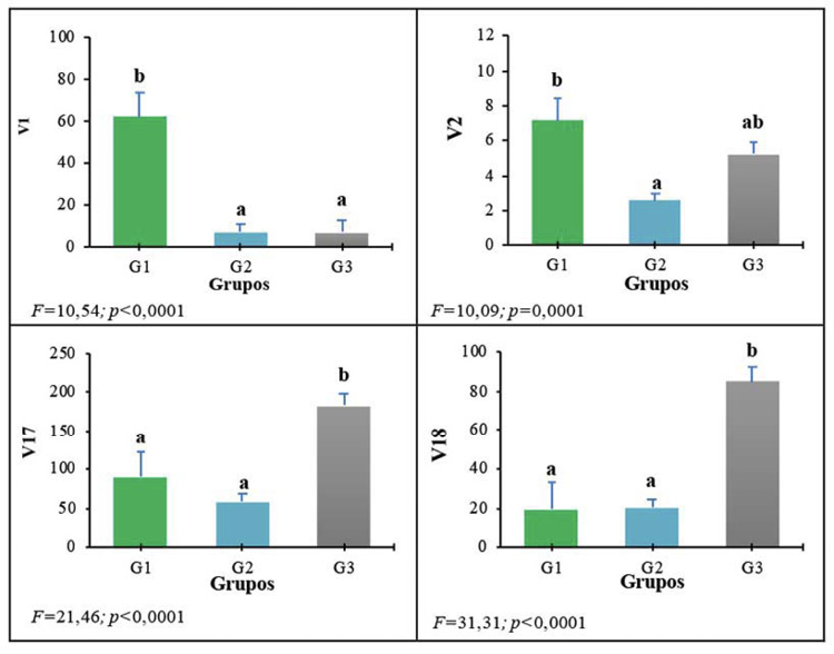 Figura 5. Comparación de variables V1, V2, V17 y V18 entre los tres grupos identificados por el análisis de conglomerados de unidades de producción agroindustrial (UPA) de panela [azúcar moreno sin refinar no centrifugado, obtenido de la evaporación y concentración de jugo de caña de azúcar (Saccharum spp.)]. Huila, Colombi. 2019.