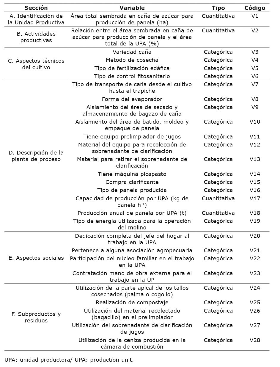 Table 1. Selected key variables for the construction of typologies of agro-industrial production units (UPA) of panela [non centrifugal unrefined brown sugar, obtained from the evaporation and concentration of sugarcane (Saccharum spp.) juice]. Huila department, Colombia. 2019.