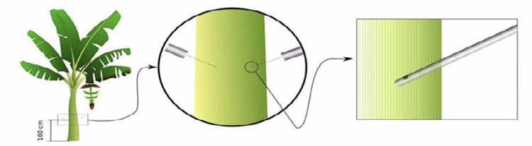 Las inyecciones se hicieron en plantas que tuvieran ocho semanas después de floración con el fin de hacer la aplicación en el momento de la mayor ganancia de peso seco del racimo (Castillo González et al., 2011; Cayón Salinas, 2004; Chaves et al., 2009). Así mismo, se buscó garantizar que la solución llegara a los vasos del xilema y luego fuera absorbida, por lo tanto, la inyección se aplicó a una altura de 1 m del suelo con un ángulo entre 45° a 60° y la dosis en cada planta fue dividida en dos (Figura 1), con una inyección por cada lado de la planta con 50 % de la dosis reportada en el Cuadro 4.