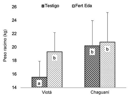 Figura 2. Respuesta del peso del racimo a la fertilización edáfica del plátano (Musa AAB) en Viotá y Chaguaní, Cundinamarca, Colombia. 2018.