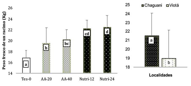 Hubo diferencias significativas (p≤0,05) entre las dos localidades y entre las soluciones inyectadas en la variable peso de racimo (Figura 3), sin presentarse interacción entre estos dos factores. La inyección de nutrientes y aminoácidos en las dosis evaluadas en las dos localidades incrementó el rendimiento de las plantas en comparación con el testigo sin inyección, pero no hubo diferencias significativas (p≤ 0,05) entre las dosis de ambas soluciones inyectadas (AA y Nutri) (Figura 3).