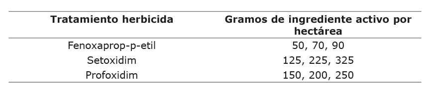 Los tratamientos consistieron en los herbicidas fenoxaprop-p-etil 50 g i.a. ha-1, setoxidim 125 g i.a. ha-1 y profoxidim 150 g i.a. ha-1. Estos herbicidas se aplicaron en dos estados fenológicos del arroz Palmar 18 (2-3 y 4-5 hojas), se incluyó además el respectivo testigo sin aplicación de herbicidas.
