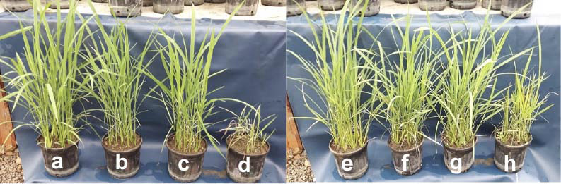 Fotografía izquierda: testigo (a), profoxidim 150 g i.a. ha-1 (b), setoxidim 125 g i.a. ha-1 (c) y fenoxaprop-p-etil 50 g i.a. ha-1 (d) aplicados en fenología de 2 a 3 hojas. A la derecha: testigo (e), profoxidim 150 g i.a. ha-1 (f), setoxidim 125 g i.a. ha-1 (g) y fenoxaprop-p-etil 50 g i.a. ha-1 (h) aplicados en arroz Palmar 18 con 4 a 5 hojas.