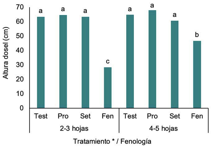 * Pro = profoxidim, Set = setoxidim y Fen = fenoxaprop-p-etil. Medias con letras iguales no son significativamente diferentes entre sí, según prueba de DGC (p>0,05).