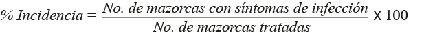 Para calcular la severidad de la enfermedad, que se consideró como la relación entre el área de infección de la mazorca entre la superficie total de esta, se empleó la ecuación 2.