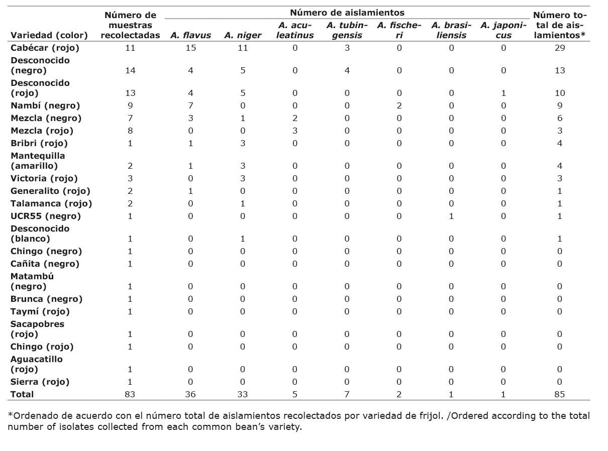 En el caso del frijol, se identificaron 83 aislamientos como Aspergillus spp., mientras que en maní, trece aislamientos se identificaron dentro de este género. Un 46 % de las muestras recolectadas de frijol presentaron contaminación con Aspergillus spp. Según el tipo de frijol, el número de muestras contaminadas con este hongo fue de: 19 (54 %) en frijol negro, 16 (36 %) en frijol rojo, 2 (100 %) en frijol amarillo y 1 (100 %) en frijol blanco. En el caso del maní, se recolectaron diecinueve muestras de las cuales 32 % mostraron contaminación por alguna especie de Aspergillus sp.
