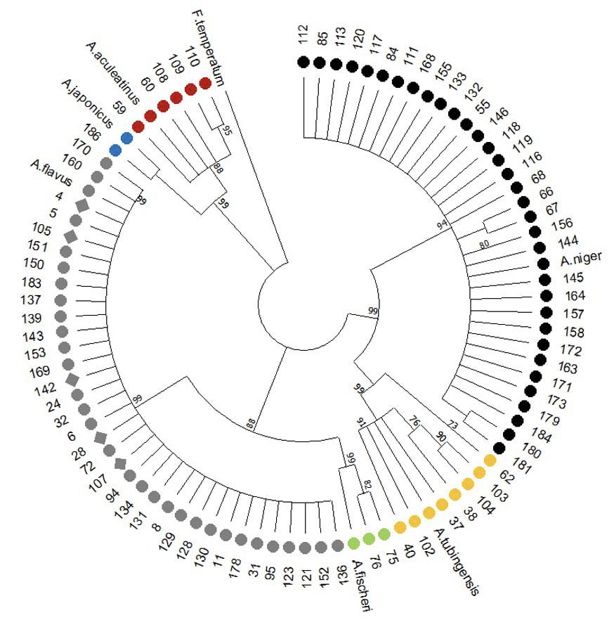 Figure 1. Maximum likelihood circular tree of the Aspergillus isolates obtained from grains of common beans (Phaseolus vulgaris L.) cultivated in Costa Rica in 2019 and 2020. Mycotoxin Laboratory of the Centro para Investigaciones en Granos y Semillas (CIGRAS), Universidad de Costa Rica, San Jose, Costa Rica.
