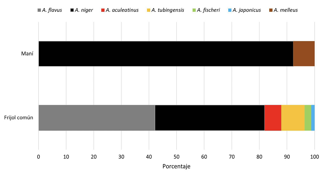 En frijol, la especie predominante fue A. flavus, hongo que produce aflatoxinas, mientras que en maní predominó el hongo A. niger, productor de ocratoxinas y fumonisinas, estas micotoxinas son dañinas para la salud humana y animal.