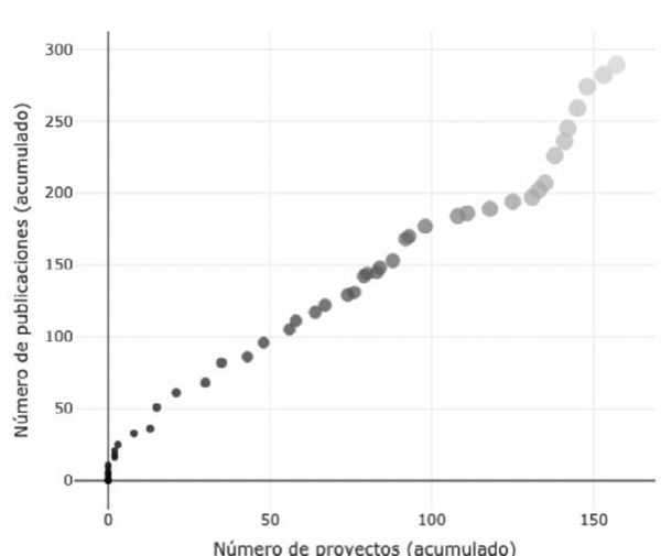 Significado de la escala de grises y tamaño de los círculos: Magnitud relacionada con el número de publicaciones y proyectos acumulados, los círculos más grandes y claros representan los mayores valores.