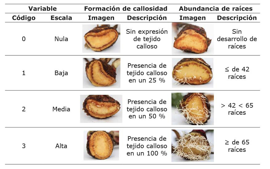 Cuadro 4. Formación de callosidad baja, media y alta con enraizamiento nulo y bajo en accesiones de arracacha (Arracacia xanthorrhiza Bancroft), según escala de callosidad y enraizamiento. Centro de Investigación La Selva, Rionegro, Antioquia, Colombia. 2019-2020.