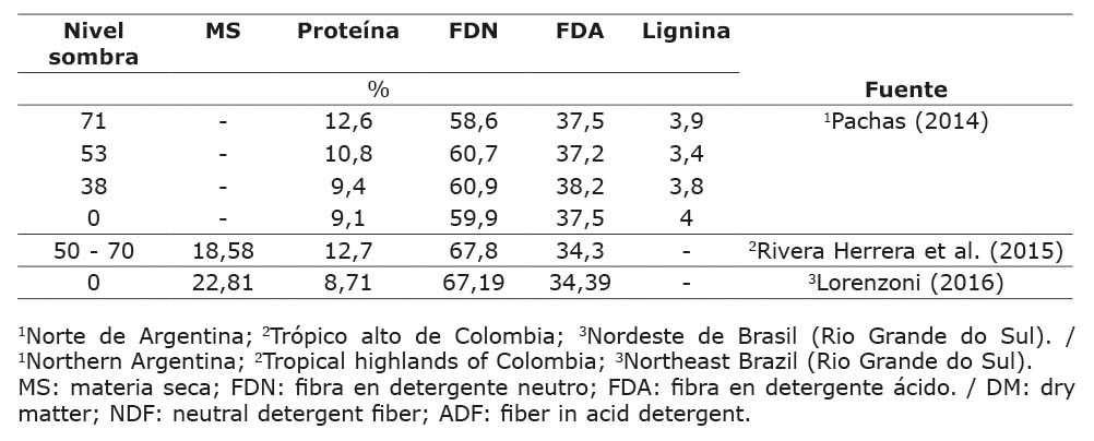 La información de la calidad composicional en condiciones de trópico alto en Colombia (Rionegro, Antioquia), al norte de Argentina (provincia de Misiones) y al Nordeste de Brasil (Rio Grande do Sul), se presenta en el Cuadro 1. La MS en general, presenta valores superiores si se compara con los aportes del pasto kikuyo (C. clandestinus) con valores entre 12 % y 14 %, que es la principal especie empleada en lecherías especializadas en trópico alto de Colombia (Correa et al., 2008). Esto puede favorecer incrementos en el consumo de MS y mejorar el balance energético proteico en vacas lecheras de alta producción.