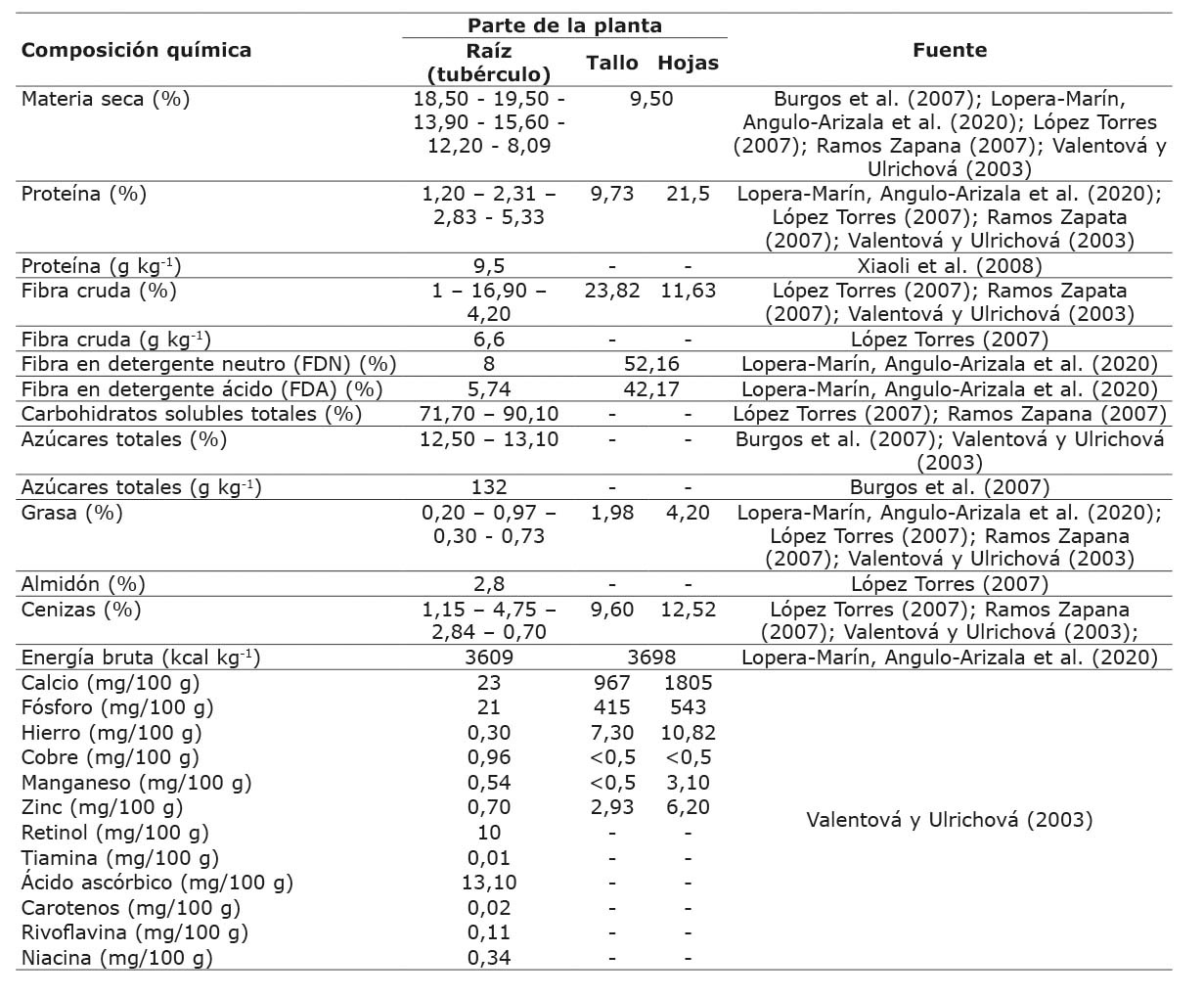 La composición química puede variar según las condiciones agroclimáticas del sitio y el uso o no de fertilizantes químicos u orgánicos. Valores de las diferentes fracciones de la planta se muestran en el Cuadro 4. El tallo y hojas del yacón, presentan contenidos medios y altos de proteína, respectivamente, y el aporte mineral, en general, es mayor en tubérculos. Estos también son ricos en proteína, vitaminas y carbohidratos totales (donde están presentes los FOS entre 50 % y 70 %), pero con baja MS.