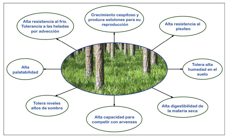 En 1996, la Estación Experimental Agropecuaria Cerro Azul del INTA, lo introdujo en el norte de Argentina en la Provincia de Misiones, donde se han realizado ensayos agronómicos y evaluación productiva bajo plantaciones forestales (INTA, 2009). Lo anterior, ha permitido asociar la forestación con el sector de la ganadería bovina a través de un arreglo silvopastoril propio para la región, donde se produce madera, carne y leche de calidad, además, se aprovechan las diversas características de esta gramínea (Figura 1) (INTA, 2009), que la perfilan como una especie de interés para incorporar en SSP en el trópico alto. En el noreste de Argentina, se ha encontrado respuesta positiva al incluirla en los arreglos silvopastoriles donde se integra la producción de madera. Una de ellas, es el incremento de producción de biomasa bajo el dosel de los árboles (Fassola et al., 2005). También se destaca por tener alta calidad, buen crecimiento y buena palatabilidad, características que lo convierten en una de las mejores opciones a considerar en el diseño e implementación de sistemas silvopastoriles (Pantiu et al., 2010).