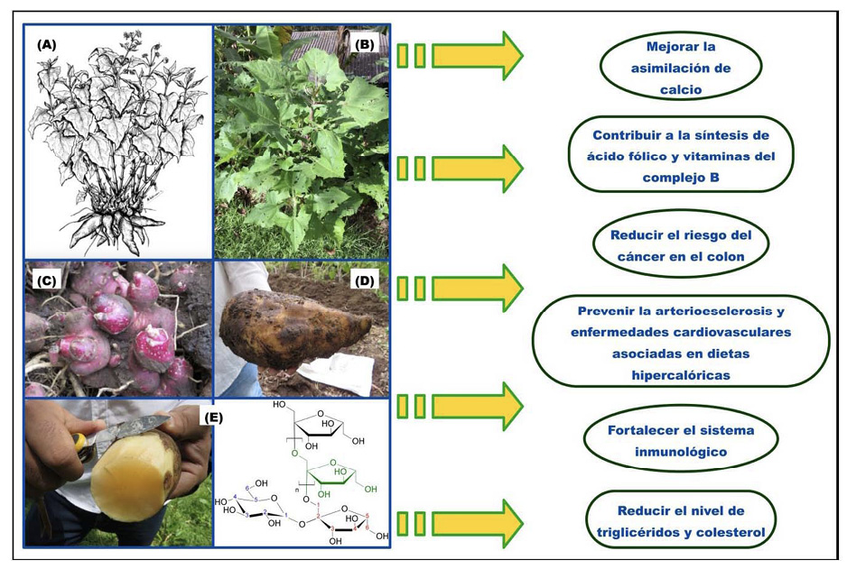 Figura 2. Efectos positivos del yacón (S. sonchifolius) sobre la salud humana (elaborado por los autores a partir de la Fuente: Sáenz Torres et al., 2016). (A) dibujo taxonómico de la planta entera (Seminario et al., 2003); (B) biomasa aérea; (C) semilla agámica o propágulos; (D) tubérculo; (E) fórmula estructural de los fructooligosacáridos (FOS) presentes en tubérculos.
