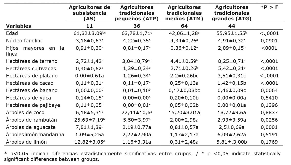 El análisis de discriminación realizado con las variables cuantitativas estudiadas (Cuadro 2), identificó mediante los estadísticos F y λ de Wilks, que fueron capaces de separar de manera significativa (p<0,05) a los agricultores tradicionales en los tres grupos identificados (ATP, ATM, ATG).