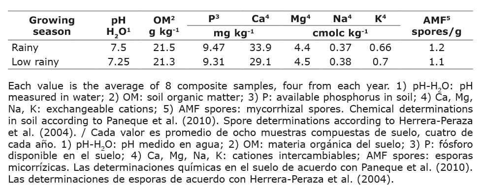 The soil was classified as Eutric Cambisol with carbonates soils by World Reference Base for Soil Resources (2014). It exhibited pH-H20 values ranging from 7.2 to 7.5 (slightly alkaline) (Table 1), high calcium (Ca) content, and moderate levels of exchangeable magnesium (Mg) and potassium (K), as well as available phosphorus (P). Organic matter values were low and associated with degradation processes resulting from continuous soil exploitation. The quantity of mycorrhizal spores was low (1.2 spores/g), likely due to continuous cultivation, high fertilization, and soil degradation processes (Guo et al., 2020). These characteristics are commonly observed in this type of soil under continuous cultivation (Ruíz Martínez et al., 2012; Simó González et al., 2020).