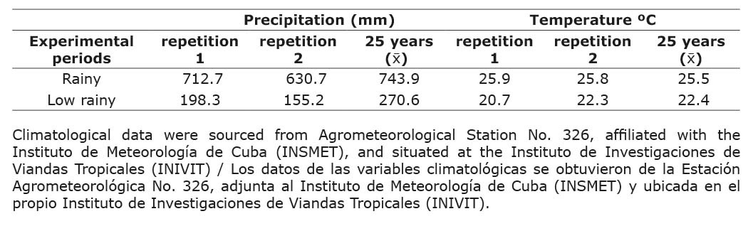 The mean temperature and accumulated precipitation data for each experimental period, as the 25-year average, are presented in Table 2. The data were obtained from Agrometeorological Station #326 (Cuban Institute of Meteorology), located less than 0.5 km from the experimental area. Precipitation measured daily by a rain gauge (± 0.1 mm), and temperature was recorded hourly with a thermometer (± 0.1 ºC). The results are expressed as accumulated precipitation (mm) and mean daily temperatures (ºC) during the experimental periods.