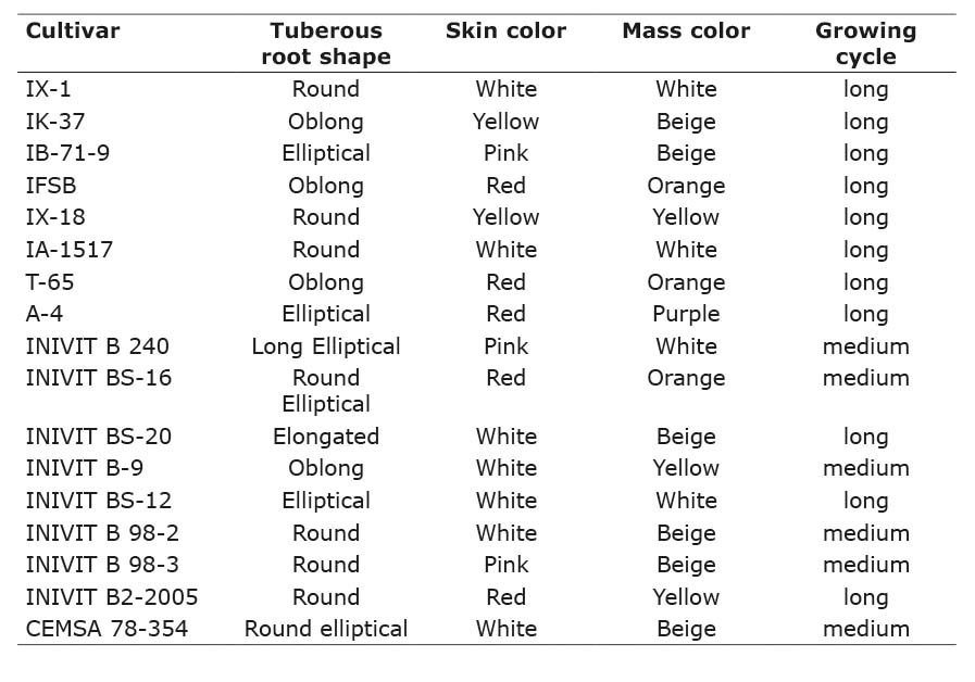 The evaluated cultivars are outcomes of the breeding program of the Tubers and Tropical Roots Institute Research (INIVIT), showing variations in phenotypic characteristics (Table 3). Long-cycle cultivars have a harvesting period of around 5 months, while medium-cycle cultivars are tipically harvested between 4 to 5 months. The last nine cultivars are commercially planted in the country (MINAG, 2012), whilethe others are promising. In all instances, these are modern cultivars developed for high yields under optimal doses of mineral fertilizers.