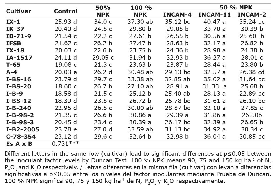 Differentiated responses to inoculation were observed among cultivars, wherein INCAM-11 consistently yielded the highest results in each of them. In nine cultivars, INCAM-11 led to significantly higher yields (p≤0.05) compared to those obtained with 100 % NPK; for the remaining cultivars, it produced similar results, always surpassing the 50 % NPK treatment.