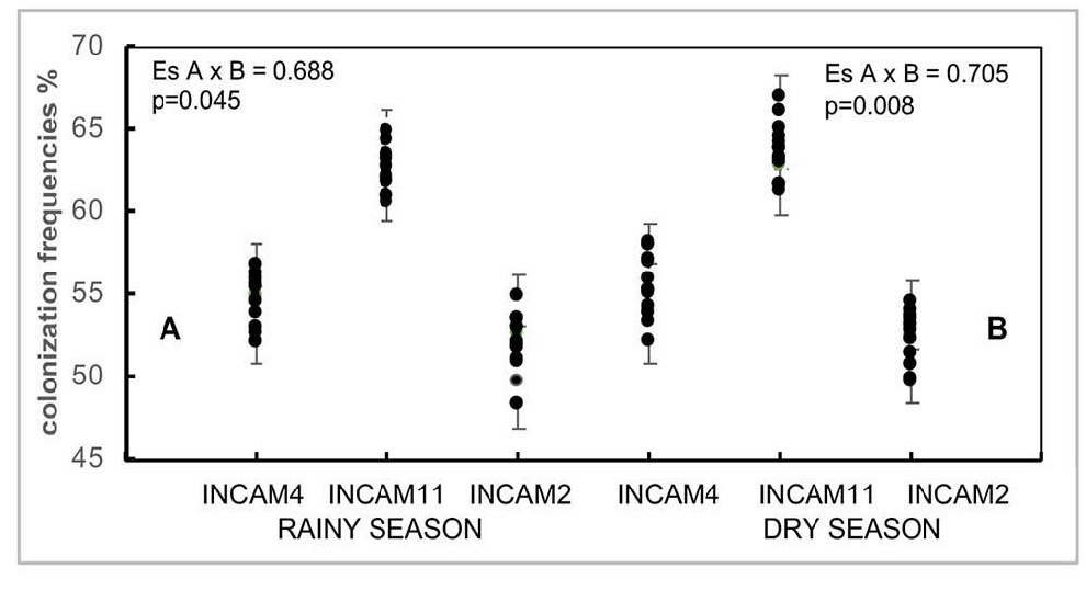 Colonization frequencies when INCAM-11 was applied ranged between 60.8 and 64.2 % in rainy period, and between 61.1 % and 66.9 % in low rainy period, showing differences (p≤0.05) in each period among some cultivars, but not between growing periods. When INCAM-4 and INCAM-2 were inoculated, the colonization frequencies veried between 52.6 % – 56.8 % and 48.3 % - 54.9 % in the rainy period, and between 52.1 % - 57.9 % and 49.6 % – 54.5 % in the low rainy period respectively, showing some differences (p≤0.05) between cultivars in each period, but not between growing periods. Non-inoculated cultivars presented the lowest values of colonization frequency (p≤0.05), ranging from 9 % and 18 %.