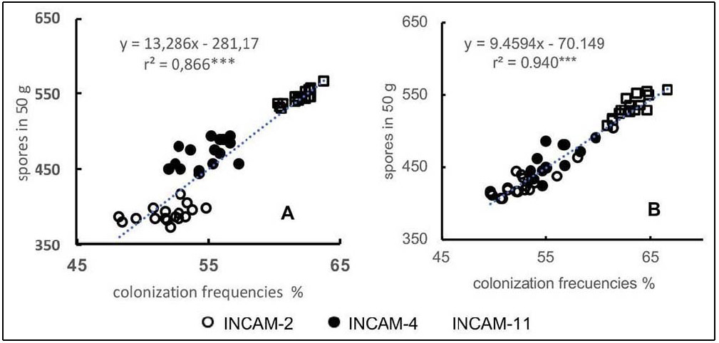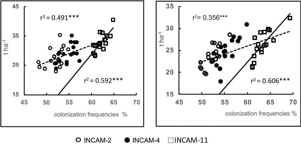 In both seasons, higher colonization frequencies were consistently observed when inoculating any of the cultivars was inoculated with INCAM-11, compared to those obtained with the other two inoculants. Moreover, when considering only the inoculation with INCAM-11, the determination coefficients (r2) increased to aprproximately 0.6 (p≤ 0.001) in both growth periods (solid lines in Figure 2 A and 2 B). These values were notably higher than the determination coefficients obtained when analyzing the results of each of the other inoculants individually, which ranged from 0.2 to 28 (not significant) in both periods.
