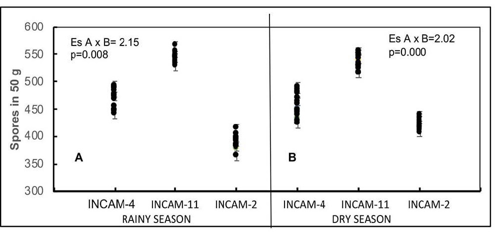In the present experiments during the high-yield season, only one cultivar (INIVIT B 98-2), across both repetitions, achieved similar yields when inoculated with either INCAM-11 or INCAM-4. However, even in this cultivar, the percentages of colonization and spore counts were consistently higher when inoculated with INCAM11. Moreover, in the low rainy and cold season, while there were no significant differences in yields between the two isolates, the frequencies of colonization and spore counts were notably higher in all cases when INCAM-11 was applied. Therefore, it doesn’t seem that the phenomenon of compatibility (Rivera et al., 2007) is evident in any of these cultivars with the studied inoculants.