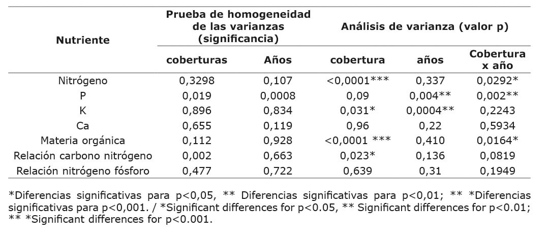 Se obtuvieron diferencias significativas entre coberturas (p<0,05) en las concentraciones de potasio, relación carbono nitrógeno y altamente significativas (p<0,0001) para nitrógeno y la materia orgánica. También se observaron diferencias significativas en los diferentes años para las concentraciones de fósforo (p<0,01) y potasio (p<0,001), y en las interacciones cobertura x año para nitrógeno (p<0,05) y el fósforo (p<0,01) (Cuadro 2).