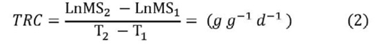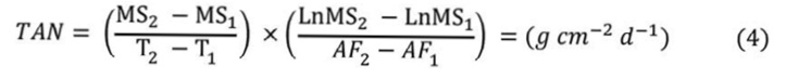 Donde, TRC es la tasa relativa de crecimiento de las plantas, LnMS1 es el logaritmo natural del peso seco aéreo al inicio del período establecido, LnMS2 el logaritmo natural del peso seco aéreo al final del período establecido, T1el tiempo en días al inicio del período establecido, T2 el tiempo en días utilizado al finalizar el período establecido, TAC la tasa absoluta de crecimiento, MS1 el peso seco aéreo al inicio del período establecido, MS2 el peso seco aéreo al final del período establecido, TAN la tasa de asimilación neta, AF1 el área foliar al inicio del período establecido y AF2 el área foliar al finalizar el período establecido.