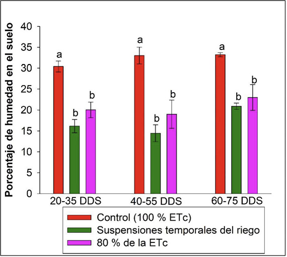 El porcentaje de humedad en el tratamiento control fue mayor en las tres etapas evaluadas, con porcentajes de 30, 33 y 33, respectivamente. En la primera etapa de 20-35 DDS, el tratamiento con suspensión del riego presentó 16 % de humedad del suelo, mientras el tratamiento con el 80 % del riego mostró 20 % de humedad. En la segunda etapa los tratamientos con suspensión y reducción del riego presentaron 14 % y 19 % de humedad, respectivamente. Mientras que en la tercera etapa la humedad del suelo fue de 20 % para el tratamiento con suspensión de riego y 23 % y en el de riego reducido (Figura 1).