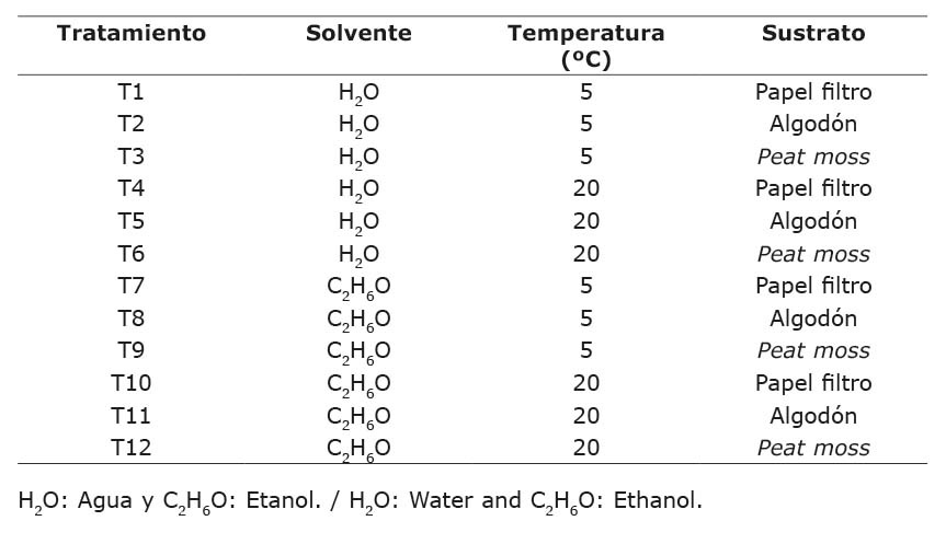 Se realizó un pretratamiento a la semilla, el cual consistió en colocar 2 g de semilla en etanol (C2H6O) al 70 %, y agua, en proporción (75:25), durante 24 horas. Posteriormente, la semilla se lavó con agua potable comercial. Como testigo absoluto se utilizaron otros 2 g de semilla inmersos solo en agua potable comercial por 24 horas. Después de ese tiempo, la semilla se drenó y se sembró una por una en cada caja Petri; el sobrante de la semilla se desechó. El número de repeticiones fue de cinco cajas por tratamiento (Cuadro 1), para lo cual se utilizaron 20 semillas/caja Petri. La fecha de siembra fue el 27 de febrero de 2023. Se utilizaron tres diferentes tipos de sustratos: sobre papel filtro n.º 1, almohadillas de algodón extra grande (9 cm de diámetro) y peat moss, un sustrato orgánico comercial (Special Fine n.º 3). Antes de proceder a la siembra, los sustratos en las cajas se hidrataron con agua potable comercial (pH 7,4). Las cajas Petri fueron colocadas en una cámara germinativa bajo oscuridad, a 5 °C y 20 °C, durante siete días. Luego, las cajas se extrajeron y se mantuvieron bajo condiciones de laboratorio, a ±25 °C. Se hicieron recuentos de la germinación cada tercer día hasta que este proceso terminó.