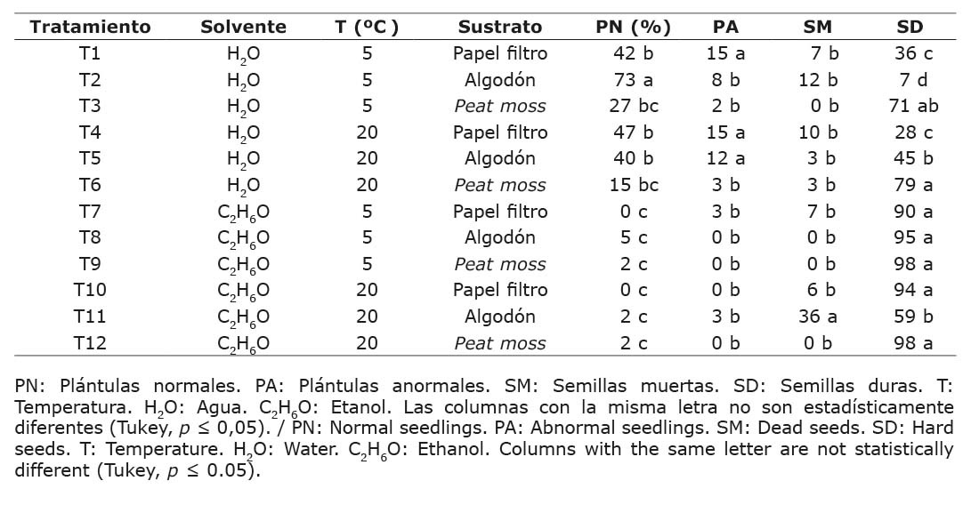 Como parte de la calidad, el proceso de limpieza de la semilla por medio de cribas produjo 80 % de pureza; el resto correspondió a material inerte. La germinación de la semilla recién cosechada fue de 12 %, y la prueba de viabilidad de la semilla arrojó un resultado del 86 %. El análisis de varianza reveló diferencias significativas en el factor temperatura (p ≤ 0,001) al evaluar el porcentaje de plántulas normales, mientras que el solvente y el sustrato mostraron efectos estadísticos significativos en plántulas normales (PN), anormales (PA) y semillas duras (SD). La interacción entre temperatura y solvente (T*S) solo tuvo significancia estadística para plántulas anormales (PA); por su parte, la interacción entre solvente y sustrato (S*SU) tuvo significancia para plántulas anormales y semillas duras (PA y SD). En cuanto a la interacción de los tres factores (T*S*SU), las plántulas normales, las semillas muertas y las semillas duras mostraron diferencias estadísticas significativas.
