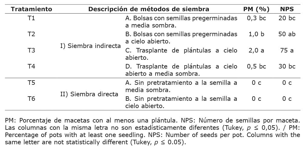 Las condiciones climáticas registradas durante el periodo de crecimiento de las plántulas en marzo y abril fueron las siguientes: temperatura máxima (28,6-28,5 °C), media (22,4-22,9 °C) y mínima (9,3-13,7 °C); precipitación pluvial que varió entre 90,4 y 82,8 mm, y humedad relativa máxima de 89,0 a 93,9 %, media de 71,8 a 78,2 % y mínima de 44,2 a 56,1 %. El mejor tratamiento (T3) fue el trasplante de la semilla en charola de unicel con peat moss a cielo abierto, con dos plántulas exitosas en el 75 % de las macetas (Cuadro 4). Este resultado fue estadísticamente similar al logrado en bolsas o macetas con semillas pregerminadas a cielo abierto, con un 50 % de éxito y una plántula en promedio por maceta.
