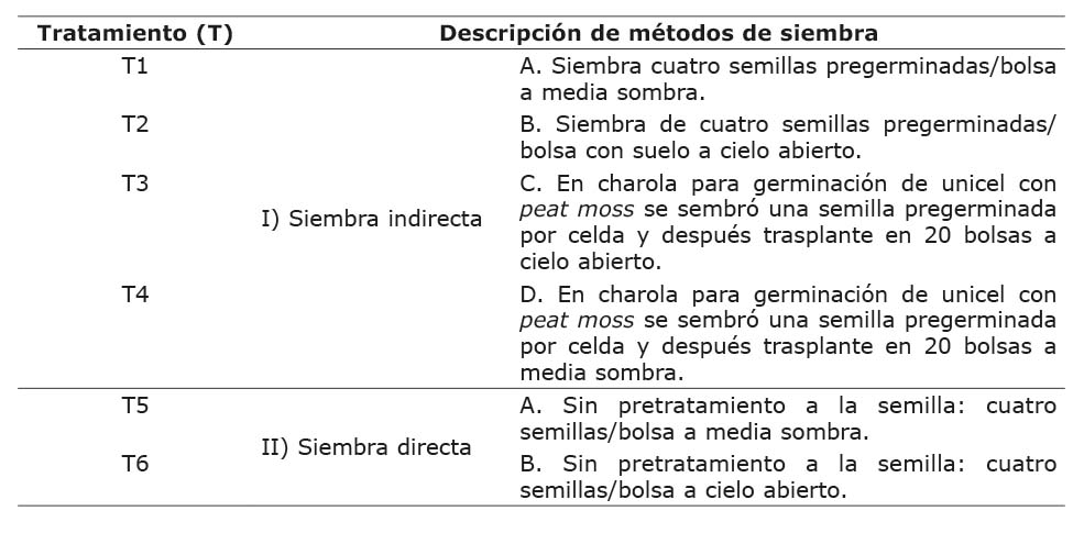 La germinación de la semilla se realizó en 25 cajas Petri, con 20 semillas por cada caja. La siembra se llevó a cabo el 27 de febrero de 2023 y el 2 de marzo de 2023 sobre piezas de algodón a capacidad de campo. Estas se mantuvieron en la cámara a 5 °C durante siete días; después, se colocaron a temperatura de laboratorio (±25 °C). Conforme fueron germinando las semillas, se trasplantaron en los diferentes métodos de siembra indirecta en el mes de marzo. El número de repeticiones por tratamiento fue de 20 bolsas, con un total de seis tratamientos (Cuadro 2). La profundidad de siembra en las bolsas o charolas fue de dos centímetros, y los riegos posteriores a la siembra se aplicaron cuando fue necesario.