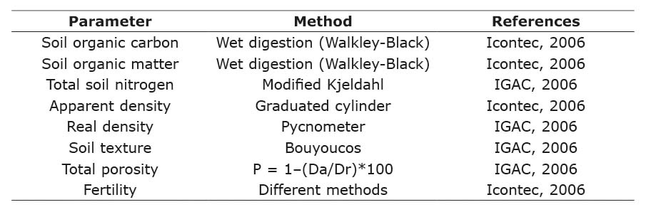 Table 2. Chemical and physical variables analyzed in soil samples in the Specialized Soil Laboratory. Universidad de Nariño. San Juan de Pasto, Colombia. 2020.