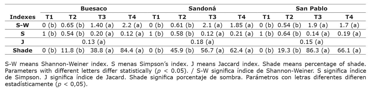 Table 3. Diversity indices and percentage of shade in the C. arabica production systems in the municipalities of Buesaco, Sandoná, and San Pablo, Nariño, Colombia. 2019 - 2020.