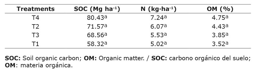 No significant statistical differences were observed in the soil organic carbon (SOC) concentration among the production systems (p > 0.51) (Table 4). However, a trend toward greater carbon accumulation was noted in T4 (coffee, banana, fruit trees, and leguminous plants), with values ranging from 66.63 Mg ha-1 to 86.83 Mg ha-1. Conversely, the lowest accumulation was observed in T1, which values ranging from 38.55 Mg ha-1 to 76.14 Mg ha-1.