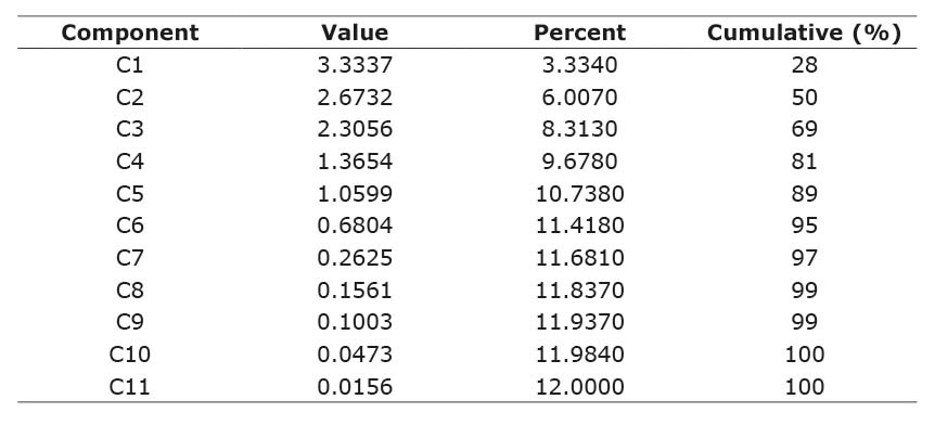 Table 5. Total variability of the different components of the production systems of C. arabica in the municipalities of Buesaco, Sandoná, and San Pablo, Nariño, Colombia. 2020.
